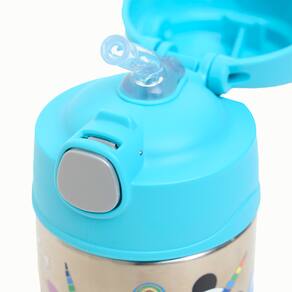 Projetada para mãos pequenas, a Thermos Funtainer F401 permite que a criança abra e feche com facilidade usando apenas uma mão, graças ao seu sistema de abertura intuitivo, ergonômico e higiênico, já que a tampa permanece fechada após o uso, sem contato com o ambiente. O canudo de silicone macio proporciona um toque suave ao beber, enquanto a alça integrada facilita o transporte, perfeita para a escola, passeios e atividades ao ar livre.