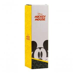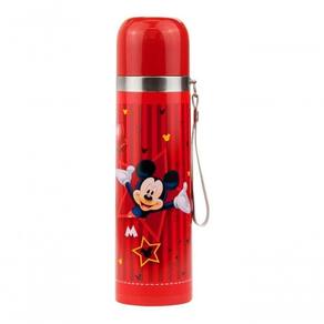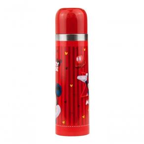 Garrafa térmica na cor vermelha gravada com a imagem da Mickey. Capacidade para 500 ml, tampa serve como copo para a bebida, que não pode ser tomada direto da garrafa. Mantém temperatura por até 2 horas a depender da temperatura ambiente. Material: plástico e inox