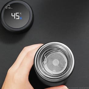Ao tocar suavemente na parte superior da tampa da garrafa, você pode verificar a temperatura da bebida dentro em qualquer lugar e a qualquer momento para beber da maneira mais adequada. Modelo em aço inoxidável com isolamento a vácuo, que mantém por longo tempo a temperatura dos líquidos.