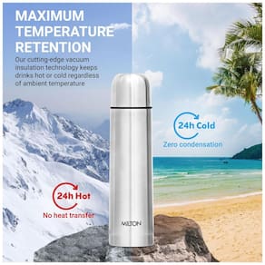 Retenção de temperatura por 24 horas A garrafa de aço inoxidável Milton foi projetada com isolamento a vácuo de parede dupla e um revestimento interno de cobre. Este design exclusivo garante que suas bebidas permaneçam quentes ou frias por 24 horas completas, independentemente da temperatura ambiente. Assim, você pode desfrutar de suas bebidas favoritas na temperatura perfeita durante todo o dia.