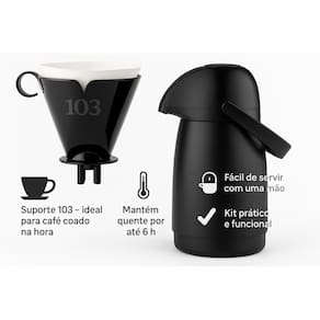 Suporte para Filtro de Café 103 e Garrafa Térmica Sanremo 500ml Praticidade, estilo e desempenho em um só conjunto! O suporte plástico Sanremo com design clássico é compatível com filtros tamanho 103 e se encaixa perfeitamente em bules, garrafas térmicas e ainda complementa a decoração da sua cozinha. Já a garrafa térmica de 500ml traz um design moderno e funcional, com sistema de bombeamento exclusivo que proporciona um jato forte e diagonal, ideal para servir sem pingos indesejáveis. Além disso, a garrafa conta com excelente desempenho térmico: conserva líquidos gelados por até 12 horas e quentes por até 6 horas. Seu acabamento polido e brilhante impressiona pela estética, enquanto a alça facilita o transporte no dia a dia ou em viagens. Todos os produtos Sanremo são livres de BPA, atóxicos e seguros para toda a família. Suporte para filtro de café tamanho 103 Encaixe ideal para bules e térmicas Garrafa térmica com sistema de jato diagonal exclusivo Conserva até 12h gelado e 6h quente Capacidade ideal de 500ml Design moderno, resistente e funcional