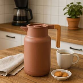 Leve praticidade, elegância e um toque de estilo natural para sua rotina com a Garrafa Térmica Santorini 1L. Com design moderno e sofisticado, ela combina forma arredondada, acabamento premium na cor terracota e cabo em madeira, criando uma peça funcional e decorativa ao mesmo tempo.