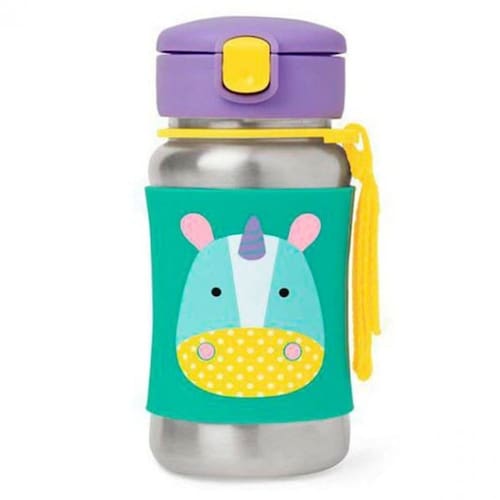 A garrafa térmica zoo da SKIP HOP tem uma altíssima qualidade perfeita para manter água e suco frio ate 6 horas, e ainda tem uma proteção de silicone que evita que as crianças fiquem com as mãos geladas enquanto segura a sua garrafinha. Características: Contém 01 garrafa de inox SKIP HOP. Design fofo da linha zoo. Capacidade de 350 ml. Medidas: 18 cm x 7 cm x 7 cm Possui uma alça lateral que permite prendela na mão da criança para facilitar o transporte. Possui um diferencial no seu design que evita a criança ficar com as mãozinhas quente ou frias. Possui tampa que guarda e protege o bico, muito mais higiênico. Vem com canudo adicional que pode ser trocado conforme a necessidade. Lavável em maquina de lavar louças compartimento superior Mantem a temperatura da bebida por até 6 horas.