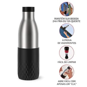 Sua bebida na temperatura ideal com apenas um ""clic"" usando a Garrafa Térmica Tefal Bludrop Preta 700ml, que mantém sua bebida por até 24h fria ou 12h quente. Esta garrafa, feita de aço inoxidável durável com acabamento em silicone, não só oferece estilo, mas também muito mais firmeza e segurança no seu dia a dia. Design feito 100% à prova de vazamentos, torna o transporte fácil e sem preocupações. Botão abre e fecha fácil com apenas um ""clic"", centralizado na tampa para não entrar em contato com a sua bebida. Diferenciais: - Mantém sua bebida 24h fria ou 12h quente. - Abre fácil, com apenas um ""clic"" - À prova de vazamentos. - Acabamento em silicone, muito mais firmeza. - Compatível com máquina de lavar louças. - Aço inoxidável: Material com isolamento térmico e resistente. - Fácil de limpar: Tampa totalmente desmontável. Desfrute da praticidade e elegância, garantindo que sua bebida esteja sempre na temperatura ideal em um ""clic"" com a Garrafa Térmica Tefal Bludrop Preta de 700ml.