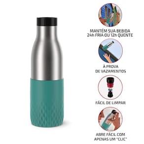 Sua bebida na temperatura ideal com apenas um ""clic"" usando a Garrafa Térmica Tefal Bludrop Verde 500ml, que mantém sua bebida por até 24h fria ou 12h quente. Esta garrafa, feita de aço inoxidável durável com acabamento em silicone, não só oferece estilo, mas também muito mais firmeza e segurança no seu dia a dia. Design feito 100% à prova de vazamentos, torna o transporte fácil e sem preocupações. Botão abre e fecha fácil com apenas um ""clic"", centralizado na tampa para não entrar em contato com a sua bebida.