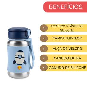 Idade Indicativa: A partir de 12 meses. Material: Aço inoxidável com capa de silicone. Capacidade: 350 ml. Medidas: 6,85 x 6,85 x 15,24 cm. Livre de: BPA, Ftalatos e PVC. Especificações de Limpeza e Manutenção: