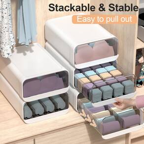 Miaocona Gaveta organizadora de roupas íntimas, gaveta de armazenamento de meias de plástico com 24 células, organizadores de armário empilháveis e caixa de armazenamento para sutiãs, meias, - ??Tamanho e cor?: Tamanho extra grande: 15,75 x 10,39 x 5,51 polegadas (40 x 26,4 x 14 cm). 24 células. Cor: branca. 1 peça. - ??Design empilhável e design de painéis transparentes?: a gaveta de armazenamento de plástico pode ser facilmente empilhada pelo compartimento de cartão na parte superior. Os painéis transparentes tornam os objetos visíveis e podem ser mais fáceis para você levar roupas íntimas, meias, gravatas, etc., e economizar espaço de armazenamento, para ser limpo e organizado. - ??Tipos alternativos?: Existem três tipos para você. 1 célula: adequado para armazenar sutiãs, roupas de bebê. 12 células: pode armazenar cerca de 12 pares de cuecas. 24 células: o tamanho da grade é adequado para armazenar meias. Você pode escolher o tamanho e o espaço que atendem às suas necessidades. - ??Vários usos e rolamento de carga forte?: seu material é espesso, suporta carga forte e não deforma. Pode ser usada como mesa de cabeceira, e a camada superior pode ser usada para colocar itens. - ??Impermeável e resistente à sujeira?: O plástico de alta qualidade é mais fácil de limpar do que o pano e não tem cheiro peculiar. O design de costura firme permite melhor resistência à umidade e poeira.