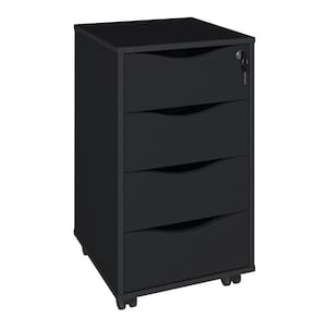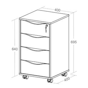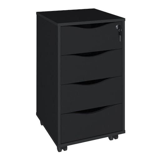 Características do Gaveteiro 4 Gavetas com Chave e Rodízios Pit: - Estrutura em MDP 15mm de espessura com fita de borda PVC com 0,45mm de espessura; - Fundo das gavetas em MDF de 3mm de espessura; - Fundo do gaveteiro em MDF de 3mm de espessura; - 4 Gavetas com corrediças metálicas de 350mm; - Rodízios em PVC com 55mm de altura e fixação por pino de aço; - Não acompanha objetos decorativos; - Montagem por conta do comprador;