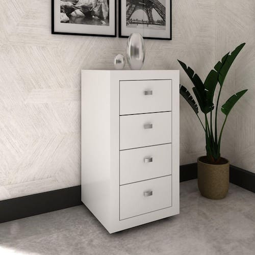 O Gaveteiro com 4 Gavetas ME 4133 possui 4 rodízios para facilitar o movimento. Ideal para uso em escritório, home office, sala de estar e dormitório. Um produto muito versátil. Possui a altura de mesa podendo aumentar a área da mesa de trabalho Acabamento da Gaveta: BP Acabamento da Prateleira: BP Altura dos Pés: 7 cm Ambiente: Sala de Estar Ambiente Principal: Sala de Estar Complexidade da Montagem: Baixa: pode ser montado por uma pessoa sozinha Cor Interna: Branco Escala de Brilho: Semi-Fosco Escala de Brilho da Gaveta: Fosco Escala de Brilho da Prateleira: Semi-Fosco Estilo de Cor: Branco Gaveta com Chave: Não Itens Inclusos: 1 Gaveteiro e Manual de Montagem. Linha ou Coleção: ME 4133 Material da Gaveta: MDP Material da Prateleira: MDP Material dos Pés: PVC Material Principal: MDP Necessita Montagem: Sim Peso: 16,45 kg Peso Máximo por Gaveta: 3 kg Peso Máximo por Prateleira: 0 kg Possui Pés: 04 Possui Portas: Não Possui Prateleiras: Não Recomendações de Uso, Manutenção e Limpeza: Utilize um pano levemente umedecido com água, seguido de um pano seco. Rodízio com Trava: Não Sapatas Niveladoras: Não Sistema de Montagem: Minifix, cavilha, parafusos e malhetes. Suporta Até (kg): 16 kg Tipo de Corrediça da Gaveta: Metálica Simples Tipo de Gaveta: Externa Tipo de Módulo: Gaveteiro Tipo de Puxador: Externo Tipo de Puxador da Gaveta: Externo Ean: 7898401753921