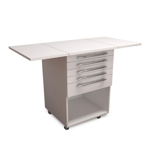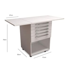 - Mesa auxiliar clínica composta por 4 (cinco) gavetas, com as seguintes alturas 6 cm, 6 cm, 12 cm, 12 cm e 2 (duas) abas retráteis;