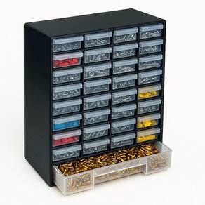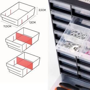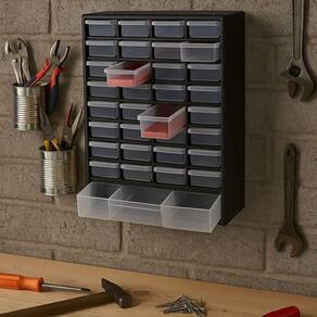 GAVETEIRO ORGANIZADOR COM 33 GAVETAS PLÁSTICO PRETO PAREDE BANCADAIDEAL PARA FERRAMENTAS PEQUENAS, ARTESANATO, COSTURA E MUITO MAIS!Mantenha tudo em ordem com o Gaveteiro Organizador com 33 Gavetas, perfeito para guardar pequenas peças de ferramentas, itens de costura, materiais de artesanato, ferragens e outros suprimentos essenciais do dia a dia.VERSATILIDADE TOTALPode ser utilizado em bancadas, balcões ou montado na parede (acompanha ferragens para fixação).Ideal para oficinas, escritórios, ateliês, salas de costura e ambientes domésticos.ORGANIZAÇÃO EFICIENTE32 gavetas pequenas com divisórias internas (cada uma pode ser dividida em até 3 compartimentos).1 gaveta grande para armazenar peças maiores com praticidade.Gavetas translúcidas, resistentes e com pegadores que facilitam a abertura e visualização do conteúdo.MATERIAL RESISTENTE E DURÁVELFabricado em plástico poliestireno de alta qualidade, leve e super resistente.Gavetas inquebráveis, ideais para uso frequente em ambientes de trabalho.ESPECIFICAÇÕES TÉCNICASCor: PretoMaterial: Plástico resistente (poliestireno)Dimensões gerais: 40 cm (altura) x 30 cm (comprimento) x 13 cm (largura)DIMENSÕES DAS GAVETASGavetas pequenas (32 unidades): 7 cm (comp.) x 12 cm (larg.) x 3,5 cm (alt.)Podem ser divididas em 3 partes de 4 cm de largura cada.Gaveta grande (1 unidade): 28,5 cm (comp.) x 12 cm (larg.) x 5 cm (alt.)O PACOTE INCLUI1 Gaveteiro com 33 gavetas (32 pequenas + 1 grande)Suporte para fixação na paredeOrganize seu espaço com estilo e funcionalidade! O Gaveteiro Organizador com 33 Gavetas é a solução perfeita para quem busca praticidade e eficiência na organização do dia a dia. Marca: FAÇA E RESOLVA