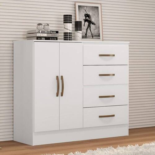 Feito em MDP. Contém 4 gavetas com corrediças metálicas facilitando a abertura e deslizamento, e 2 portas.