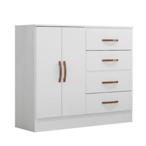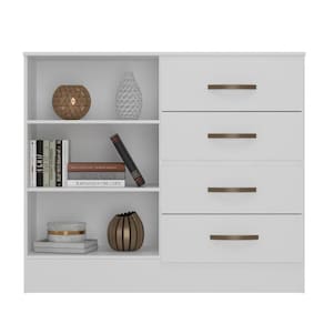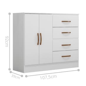 Feito em MDP. Contém 4 gavetas com corrediças metálicas facilitando a abertura e deslizamento, e 2 portas.