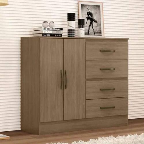 Feito em MDP. Contém 4 gavetas com corrediças metálicas facilitando a abertura e deslizamento, e 2 portas.