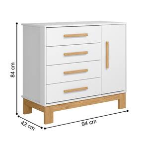 A cômoda é feita em MDP 15mm, possuindo quatro gavetas com corrediças metálicas e uma porta com amplo espaço para organizar sapatos e roupas.