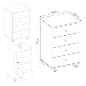 O Gaveteiro com 4 Gavetas Multimóveis CR25270 é a solução perfeita para organizar seus pertences com estilo e praticidade. Sua estrutura em MDP garante resistência e durabilidade, enquanto a pintura UV oferece um acabamento refinado, adicionando charme ao ambiente. Com quatro gavetas equipadas com corrediças metálicas, você terá espaço de sobra para armazenar seus itens de forma organizada. Além disso, os puxadores em ABS garantem maior durabilidade e os rodízios em ABS facilitam sua movimentação. Versátil, este gaveteiro pode ser utilizado como mesa de cabeceira, para guardar maquiagens ou itens de higiene no banheiro, ou na sua área de trabalho ou estudo. As gavetas suportam peso de até 3kg em cada uma.