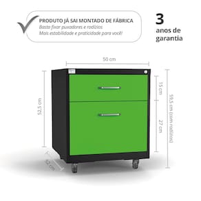 Dimensões do produto (com rodízios): 59,5 cm x 50 cm x 52 cm. Acabamento da Gaveta: Pintura Ambiente Principal: Escritório codigo_ean: 7900288318473 Complexidade da Montagem: Baixa: pode ser montado por uma pessoa sozinha Cor: Verde/Preto Cor do Produto: Verde/Preto Escala de Brilho: Semi-Brilho Gaveta com Chave: 01 Itens Inclusos: 1 Gaveteiro, Kit Ferragens e Manual de Montagem Manual de Montagem e Instalação: https://product-hub-prd.madeiramadeira.com.br/955348406/documents/9f5d6ba9-2f86-4dcc-ab3d-ba1716ca6074c3101829647517537919225441.pdf Marca: Isma Material da Gaveta: Aço Material Principal: Aço Necessita Montagem: Sim Origem do Produto: Nacional Peso: 12,1 kg Peso Máximo por Gaveta: 15 kg Possui Acabamento na Parte de Trás: Sim Possui Gaveta para Pasta Suspensa: Sim Possui Portas: Não Possui Prateleiras: Não Recomendações de Uso, Manutenção e Limpeza: Limpar apenas com pano macio e levemente umedecido. Em seguida, utilizar um pano macio e seco. Rodízio com Trava: Sim Sapatas Niveladoras: Não Sistema de Montagem: Parafusos Suporta Até (kg): 15 kg Tipo de Corrediça da Gaveta: Plástica Tipo de Puxador da Gaveta: Externo Marca: Não Informado