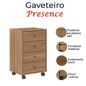 Para deixar seu quarto mais funcional e organizado apresentamos o gaveteiro da linha Presence fabricado pela Demóbile com materiais de alta qualidade em MDP. Possui 4 gavetas equipadas com corrediças metálicas puxadores e rodízios em plástico ABS. N ão perca mais tempo a hora e agora venha garantir já o seu!