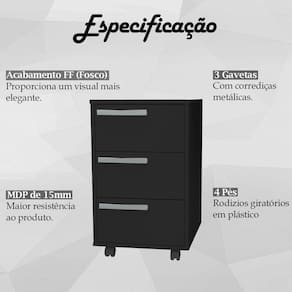 Gaveteiro Para Escritório Gamer 3 Gavetas e 4 Rodízios B26, uma peça moderna e versátil, ideal para deixar seu setup gamer mais elegante e cheio de personalidade. Estrutura produzida em MDP de 15mm, oferecendo solidez e resistência a peça. Contando com acabamento FF (Fosco), garantindo durabilidade e estilo ao produto. Composta por 3 Gavetas equipadas com corrediças metálicas e puxadores em plástico, com amplo espaço para armazenar itens e 4 pés rodízios giratórios. Suportando até 5kg cada gaveta. Perfeito para ter seus itens ao alcance, oferecendo mais praticidade em seus momentos de gameplay. Este móvel chegará na sua casa separado em 1 volumes.