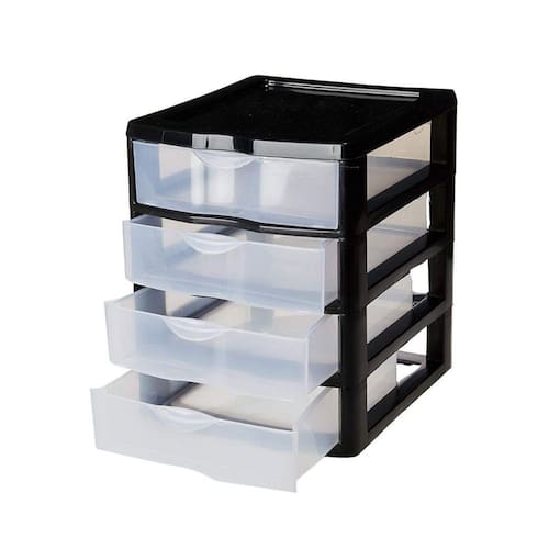 Local Indicado Mesa; Material Plástico; Dimensão: 21 x 18 x 22,5 CM Cor: Preto; Quantidade de Gavetas: 4 gaveta s ; Capacidade de Peso da Gaveta: 10 Kg; Complexidade de Montagem: Entregue Montado;