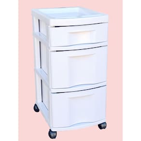 2 gavetas grandes brancas e 1 gaveta pequena branca Estrutura branca 4 rodízios de plástico preto