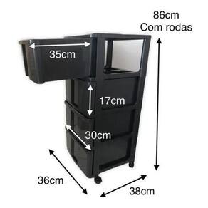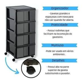 Gaveteiro porta tudo com 4 gavetas monte libano DescriçãoGaveteiro organizador 4 gavetas resistente com rodinhas Precisando de um bom gaveteiro para organizar seus objetos Este gaveteiro é super prático para organizar o que precisar. Possui rodas que facilitam a locomoção, podendo levá-lo de um cômodo a outro. Feito de plástico resistente, possui uma aba discreta para abrir as gavetas e possui trava para que a gaveta não saia da estrutura do gaveteiro. São quatro gavetas grandes e muito espaçosas. Pode usá-lo em casa, no escritório, na garagem, é ótimo para salão de cabelereiro por conta da mobilidade. Este gaveteiro é uma ótima opção para deixar tudo em ordem Descrição do produto: Material: plástico polipropileno Cor: preto Marca: monte líbano Dimensões: comprimento 38cm x altura com as rodinhas 86cm x largura 36cm. Altura sem as rodinhas: 80cm Dimensões internas das gavetas: profundidade 35cm x altura 17cm x largura 30cm. Obs.: fotos meramente ilustrativa. Anúncio referente a um gaveteiro multiuso com 4 gavetas.