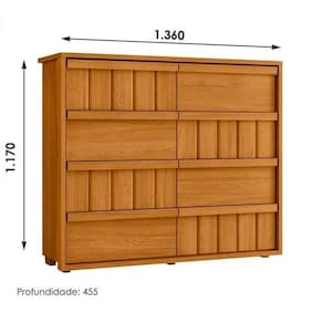 Diferenciais do produto: Acabamento padrão Madetec 100% MDF, Moldura envoltória de 25mm, Gavetas com ripado angular, 8 Gavetas com corrediças telescópicas, Puxadores em MDF estilo cava, Moldura envoltória e tampo de 25mm, Largura de 1,36m.