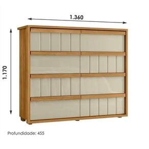 Diferenciais do produto: Acabamento padrão Madetec 100% MDF, Moldura envoltória de 25mm, Gavetas com ripado angular, 8 Gavetas com corrediças telescópicas, Puxadores em MDF estilo cava, Moldura envoltória e tampo de 25mm, Largura de 1,36m.