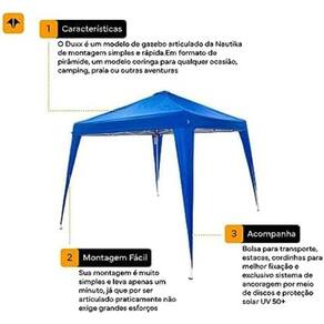 Especificações Técnicas: - Modelo: Gazebo Duxx - Tamanho: 3x3 Metros - Material da Estrutura: Liga de Aço - Material da Cobertura: Poliéster 250D - Cor: Azul - Uso Recomendado: Camping, lazer e praia - Marca: NTK - Dimensões do produto: 3 x 3 Metros; 14 quilogramas
