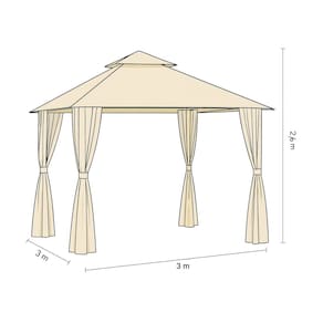 – Dimensões do gazebo montado: 3,00 m (largura) x 3,00 m (comprimento) x 2,60 m (altura)