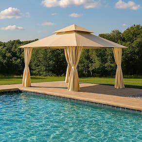 A cobertura em poliéster de alta qualidade protege contra o sol e o vento, enquanto as cortinas laterais inclusas proporcionam charme extra à decoração e mais privacidade para seus momentos de lazer.