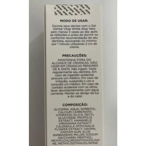 GEL Dental Natural Vitae White Aloe vera 120g Evita o mau hálito, auxilia na redução da sensibilidade dos dentes e tem ação contra aftas e sangramentos gengivais. - Não contém flúor. - Desenvolvido com Extratos naturais: Própolis - O Própolis é um forte antibacteriano natural, com dezenas de benefícios cientificamente comprovados. Hamamélis - Essencial para tratar as inflamações da gengiva e mucosa da boca. Calêndula - A calêndula acalma as dores de dente e previne com grande eficácia as inflamações na gengiva. Mentol - O mentol é uma das substâncias mais eficazes para tratar o mal hálito devido ao sabor e ação refrescante. Você com um sorriso ainda mais branco e hálito refrescante. - Promove sensação refrescante - Auxilia na remoção da placa bacteriana - Ação - Ajuda a prevenir a formação do tártaro - Protege contra cáries - Diminui o surgimento de aftas - Auxilia na prevenção da gengivite - Fortalece o esmalte dos dentes, diminuindo a sensibilidade - Combate o mau hálito - Trata-se de um gel dental 100% natural e não possui flúor na fórmula.