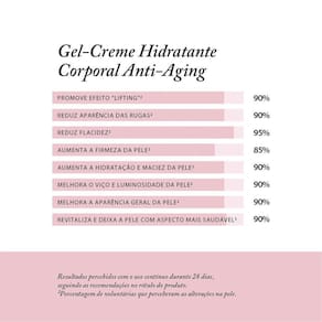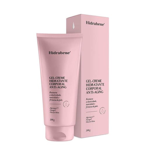 GEL-CREME HIDRATANTE CORPORAL ANTI-AGING 200g Os cuidados intensivos de hidratação da pele do corpo são fundamentais para mantê-la jovem e bonita. Hidrabene Gel-Creme Hidratante Corporal Anti-Aging tem ação multidimensional sobre todos os aspectos do envelhecimento cutâneo. Contém ativos que hidratam de forma intensa, ativam a biossíntese do colágeno e restauram o equilíbrio, elasticidade, tonicidade e firmeza da pele. Produto com textura agradável, fácil de aplicar e espalhar, sendo rapidamente absorvido pela pele. Dermatologicamente testado, hipoalergênico, formulado de maneira a minimizar possível surgimento de alergia.