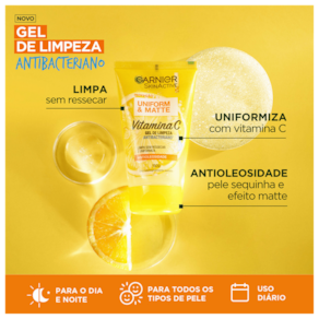 Gel de limpeza facial antibacteriano. Garnier Uniform & Matte Vitamina C limpa profundamente a pele, sem ressecar e controlando a oleosidade.