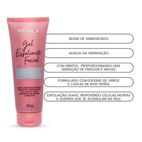 Nosso Gel Esfoliante para o rosto MENELA pode ser no pré preparo do design de sobrancelha e no cuidado diário da pele da nossa designer de sobrancelha e suas clientes. Nosso gel esfoliante para o rosto contém em sua formulação, de arroz e cascas de noz moída, que promovem uma esfoliação suave, removendo células mortas e sujeiras que se acumulam na pele no dia a dia. Além disso, contém um blend de aminoácidos, que auxilia na hidratação e o Mentol, que proporciona uma sensação de frescor e maciez na pele. Como aplicar o nosso gel esfoliante para o rosto Antes de aplicar o gel faça a limpeza do rosto com o sabonete líquido para o rosto MENELA. Após a limpeza, aplique o Gel Esfoliante MENELA no rosto úmido e massageie suavemente com as mãos, em movimentos circulares. Em seguida, enxágue o gel esfoliante com água em abundância. Recomendamos o uso do gel esfoliante para o rosto de 02 à 03 vezes por semana. Nosso gel esfoliante é indicado para todos os tipos de pele. Marca: Não Informado