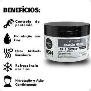 O Gel Fixador Salon Line Men Essence Fixação Média Aspecto Molhado promove controle do penteado, efeito molhado e ação condicionante. Sua fórmula contém ácido hialurônico e mentol, ativos que proporcionam hidratação e refrescância aos fios. É indicado para todos os tipos de cabelo.
