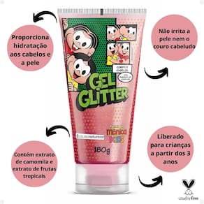 O Gel Glitter Corpo e Cabelos, contém extrato de camomila e extrato de frutas tropicais que proporcionam hidratação aos cabelos e a pele, além de conferir brilho intenso.