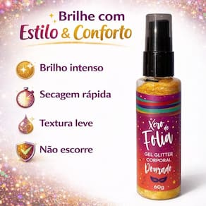 Gel Glitter Corporal Cia da Natureza Xerô de Folia Brilho Intenso e Secagem Rápida | 60g Brilhe em qualquer ocasião com o Gel Glitter Corporal Cia da Natureza! Com textura leve e fácil de espalhar, ele realça a pele com um efeito luminoso incrível, deixando seu visual moderno, alegre e cheio de atitude. Seca rápido, não escorre e entrega um acabamento bonito e uniforme.