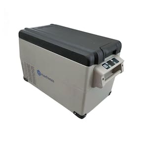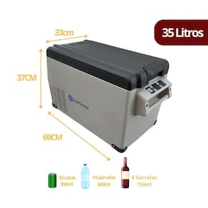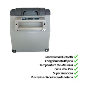 Geladeira portátil quadrivolt 12v/24v - 110v/220v com modo congelamento máximo ou modo economia eco. Possui 1 compartimento maior e outro menor, luz de LED interna e ajuste de temperatura. Tipo de refrigeração: compressor LG. Resfriamento até -20ºC. Potência: 45W. Conexão via Bluetooth para controle de temperatura, voltagem e bateria.Tipo de Degelo