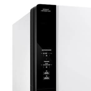 Funções do painel: Controle de temperatura (6 níveis no refrigerador e 6 no freezer); trava de painel; aviso de porta aberta