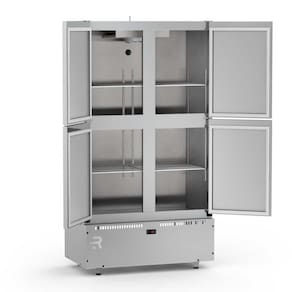 - Temperatura: 0C a 7C; - Sistema de refrigeração: Ar forçado; - Controlador digital de temperatura; - Gabinete externo em aço inox; - Gabinete interno em aço galvanizado (fundo inox); - Porta com puxador em ângulo de 45 e fechamento automático; - Isolamento térmico em poliuretano injetado; - Prateleiras: Grades aramadas com regulagem de altura; - Pés termoplásticos com regulagem de altura.