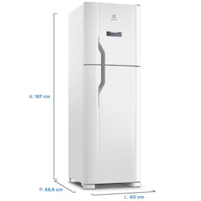 Características: Marca: Electrolux Modelo: DFN44 Capacidade total: 400 litros Capacidade da geladeira em volume: 283 litros Freezer: Sim Capacidade do freezer em volume: 117 litros Tipo de degelo: Frost Free Painel: Eletrônico Tipo de porta: Duplex Quantidade de portas: 2 portas Número de prateleiras da geladeira: 3 prateleiras Material das prateleiras da geladeira: Vidro temperado Congelador: Não Portas reversíveis: Não Gaveta de vegetais: Sim Gaveta multiuso: Sim Porta latas: Sim Controle de temperatura do refrigerador: Sim Fabricador de gelo: Não Dispenser de água: Não Dispenser de gelo: Não Alarme de porta aberta: Sim Luz interior: Sim Eficiência energética: A Consumo: 53,5 kWh/Mês Frequência: 60 Hz Inmetro: 005404/2016 Origem: Nacional
