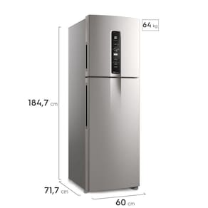 Características Adicionais - Acabamento da Porta/Frontal: Inox LookAcabamento Lateral: VCMAlarme de Porta Aberta: SimAltura (embalado) (mm): 187,9 cmAltura do produto: 184,7 cmAutoSense: SimCapacidade Bruta do Freezer (L): 126Capacidade Bruta do Refrigerador (L): 298Capacidade Bruta Total (L): 423Capacidade Líquida do Freezer (L): 117Capacidade líquida do refrigerador (L): 293Capacidade Líquida Total (L): 409Cesta Porta-Ovos: SimClassificação Energética: A+++Compartimento Congelamento Rapido: SimCompartimento Extra Frio: SimCompartimento FlexiSpace: NãoConectividade: NãoConsumo Energético (kWh/Mês): 42,4Conteúdo da Embalagem: Refrigerador, Porta Ovos, Forma de Gelo, Guia Rápido e Manual de Instruções.Controle de Temperatura: AutomáticoCor: Inox LookCor da Porta: Inox LookCor do Gabinete (Interior): BrancoDegelo Automático: SimDimensões do produto (AxLxP): 184,7 cm x 60 cm x 71,7 cmDimensões do produto embalado (AxLxP): 187,9 cm x 64,9 cm x 74,7 cmDispenser de Água na Porta: NãoDispenser de Gelo na Porta: NãoFiltro Desodorizador: Sim, TasteGuard (Vendido Separadamente)Frequência (Hz): 60Função Turbo Freezer: NãoFunção Turbo Refrigerador: NãoGarantia do Produto: 12 MesesGás Refrigerante: R600aIluminação Interna (Freezer): NãoIluminação Interna (Refrigerador): Sim (LED)Instalação : NãoLargura (embalado) (mm): 64,9 cmLargura do produto: 60 cmMaquina de Gelo Automatica: NãoMaterial /Composição: VCMMaterial das Prateleiras: Gabinete: Vidro Temperado/ Plástico Transparente Porta: Plástico TransparenteNCM: 84181000Nível de Ruído (dB): 49Painel Digital: SimPés Niveladores: SimPeso Bruto (embalado): 60 KgPeso Líquido (desembalado): 58 KgPNC: 924262913Porta Latas (prateleira de latas): NãoPorta Reversível: NãoPrateleiras Expansíveis (Fast Adapt): SimPrateleiras Removíveis: SimPrateleiras Retráteis: SimPrateleiras Reversíveis: SimProfundidade (embalado) (mm): 74,7 cmProfundidade do produto: 71,7 cmPuxadores: Sim (Embutido)Quantidade de Portas: 2Quantidade de Prateleiras e Gavetas (Freezer): Gabinete: 2 Prateleiras Porta: 2 PrateleirasQuantidade de Prateleiras e Gavetas (Refrigerador): Gabinete: 4 Prateleiras e 1 Gaveta Porta: 3 PrateleirasRodízios: SimSelo Procel: NãoSeparador de Garrafas: NãoTecnologia Inverter: SimTensão (V): 127VTipo de Compressor: InverterTipo de Degelo: Frost FreeTrava de segurança (Função Trava Painel): Sim