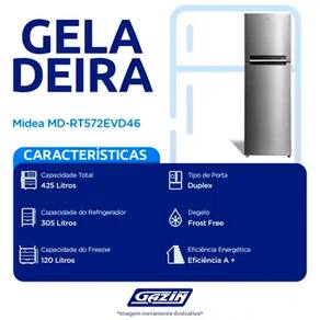 GELADEIRA MIDEA 425L FROST FREE DUPLEX MD-RT572EVD46 A Geladeira Midea Duplex com degelo frost free e classificação energética A+. é moderna e compacta por fora, gigante e tecnológica por dentro! São 425 litros de capacidade total, sendo 305 litros de espaço para geladeira e mais 120 litros para o freezer. Não precisa nem abrir as portas se quiser ajustar as temperaturas, desligar o alarme de porta aberta ou ativar o modo turbo de resfriamento, é só tocar no painel e pronto! Confira mais detalhes: