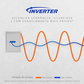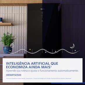 Muito além da beleza, este refrigerador conta com a avançada tecnologia Inverter, que torna o aparelho muito mais silencioso, acelera o congelamento e reduz drasticamente o consumo de energia. O sistema Smartsense complementa essa eficiência, utilizando inteligência artificial e sensores para monitorar o abre e fecha da porta, adaptando o resfriamento à rotina da sua casa para evitar gastos desnecessários.