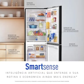 A performance superior é garantida pela Tecnologia Inverter, que torna o funcionamento mais silencioso e acelera o congelamento, enquanto o sistema Smartsense utiliza inteligência artificial para monitorar o uso diário e otimizar o consumo de energia. O painel Easy Touch em LED facilita o controle total das funções, incluindo o Drink Cooler, que indica o tempo necessário para suas bebidas atingirem a temperatura ideal.