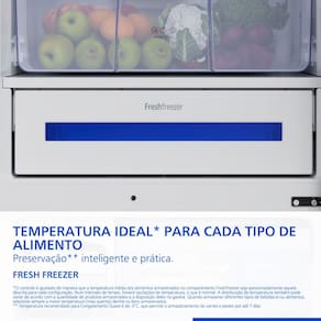 A gaveta Freshfreezer possui 4 opções ajustáveis de temperatura, independentes do restante da geladeira, permitindo o armazenamento de diversos itens na temperatura ideal para consumo, variando desde cervejas, carnes, peixes e laticínios, até porções para o preparo de refeições.