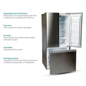 Grande Capacidade: 523 litros totais, com 365L no refrigerador e 158L no freezer, ideal para famílias grandes e para quem precisa de muito espaço.
