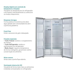 CARACTERÍSTICAS Capacidade de 486L (321L no refrigerador e 165L no freezer) Classificação ?A? em eficiência energética Sistema de refrigeração Frost Free Side by Side (freezer na porta esquerda e refrigerador na porta direta) Dispenser de água na porta com abastecimento manual (2,5L de capacidade) Painel touch Controle de temperatura do freezer e refrigerador de forma independente Freezer com temperaturas de -15°C a -22°C Refrigerador com temperaturas de 2 a 8°C Funções smart, turbo freezer e turbo refrigerador Alarme de porta aberta Porta em aço com tratamento anti-corrosão Prateleiras em vidro temperado Iluminação interna LED Divisão do refrigerador: 5 prateleiras, 1 gaveta, 3 prateleiras de porta e reservatório de água Divisão do freezer: 5 prateleiras, 1 gaveta, 4 prateleiras de porta Compressor Inverter
