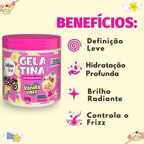 A Gelatina Capilar Salon Line Kids Vanilla Vibes! #ToDeCacho Definição Doce 550g é a solução ideal para proporcionar uma definição suave e natural aos cachos das crianças. Desenvolvida pela SALON LINE, esta gelatina oferece brilho intenso e controle eficaz do frizz, transformando a rotina de cuidados capilares em um momento divertido e perfumado. Sua fórmula é enriquecida com Extrato de Baunilha, Extrato de Cereja e Óleo de Semente de Uva, garantindo cachos definidos, saudáveis e com um delicioso aroma de baunilha, sendo perfeita para cabelos ondulados, cacheados e crespos.
